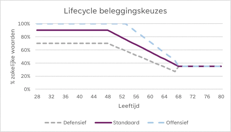 De beleggingen worden richting de pensioenleeftijd stapsgewijs aangepast naar een beleggingsprofiel dat uiteindelijk voor alle gepensioneerden hetzelfde is. Het risico wordt daarmee afgebouwd. Jongere deelnemers hebben nog een langere periode voordat zij met pensioen gaan. Daarmee kan een eventueel negatief resultaat, nog makkelijker worden herstelt. Voor gepensioneerden is de herstelkracht minder groot. Voor hen wordt dit immers direct verwerkt in de uitkeringen. Gepensioneerden nemen deel in een collectieve beleggingspot, waar ieder zijn eigen deel blijft houden en tevens risico's gedeeld kunnen worden.