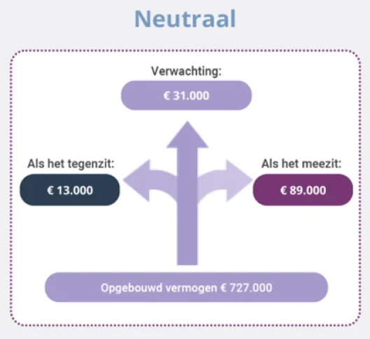 Bruto uitkering in verwachting, als het tegenzit en als het meezit. Daarbij wordt de waarde van de uitkering ook getoond. De bedragen zijn exclusief AOW.