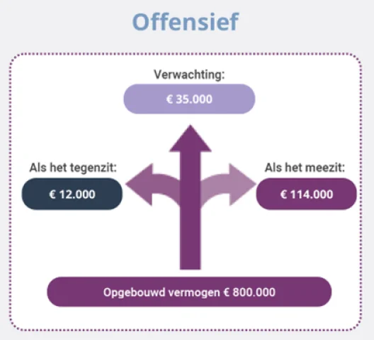 In de nieuwe flexibele pensioenregeling start de opbouwfase met uw keuze voor een beleggingsprofiel. Er zijn 3 verschillende risicoprofielen voor uw beleggingen: minder risico (defensief), neutraal of meer risico (offensief). Bij meer risico is uw pensioen naar verwachting hoger, maar de kans dat de waarde van de beleggingen daalt is ook groter. In het onderstaande plaatje is de pensioenverwachting van de 28-jarige voorbeelddeelnemer in de drie mogelijke profielen getoond.