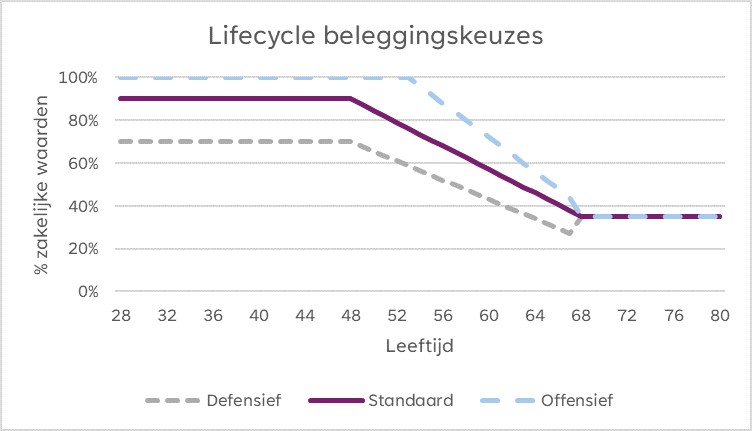 De beleggingen worden richting de pensioenleeftijd stapsgewijs aangepast naar een beleggingsprofiel dat uiteindelijk voor alle gepensioneerden hetzelfde is. Het risico wordt daarmee afgebouwd. Jongere deelnemers hebben nog een langere periode voordat zij met pensioen gaan. Daarmee kan een eventueel negatief resultaat, nog makkelijker worden herstelt. Voor gepensioneerden is de herstelkracht minder groot. Voor hen wordt dit immers direct verwerkt in de uitkeringen. Gepensioneerden nemen deel in een collectieve beleggingspot, waar ieder zijn eigen deel blijft houden en tevens risico's gedeeld kunnen worden.
